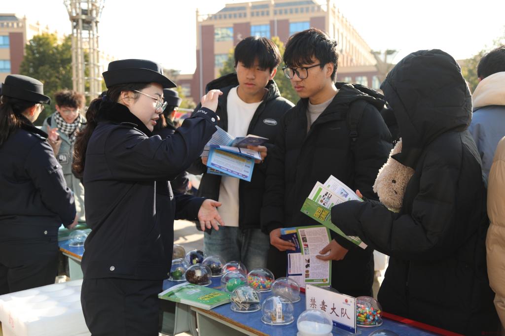 活动现场氛围热烈,各参与单位结合职能特点,通过“展板展示+资料发放+现场讲解”的多元形式,为师生送上了一份内容翔实的“安全大礼包”。宣传展板前,民警向师生细致讲解电信网络诈骗识别技巧、禁毒常识、反恐防暴要点等安全知识,结合宣传手册,进一步延伸安全知识普及覆盖面,引导大家主动关注安全、学习安全。